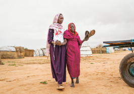 Health promoter Aisha B. (28) accompanies 80 years old Aisha G. to the MSF clinic in Adré transit camp, eastern Chad. 2024